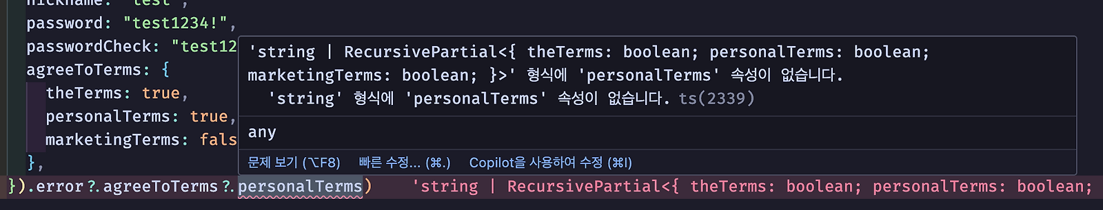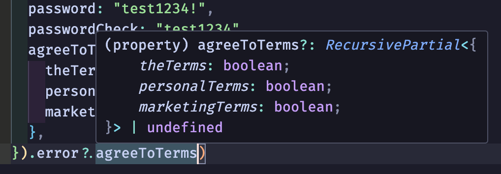 RecursivePartial 타입을 아래와 같이 수정한다고 가정해보겠습니다. 이 경우 점 표기법 등으로 깊숙한 위치의 프로퍼티에 접근할 때, 각 단계에서 해당 값이 string이 아닌 object인지 매번 확인해야 합니다. 그렇지 않으면 모든 프로퍼티 접근 시 타입 에러가 발생하게 됩니다. 따라서 root 값에 접근하는 경우에 대해 실제 타입을 그대로 반영하기보다는 그때그때 as string으로 단언해버리는 편이 훨씬 덜 번거롭다고 판단했습니다.