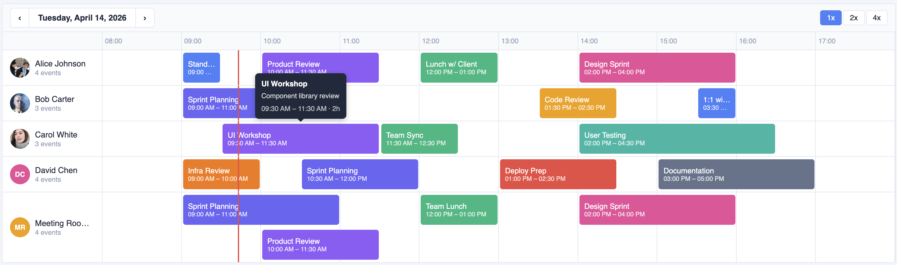 A fast, accessible timeline scheduler component for React. Supports drag-and-drop, resize, multi-row layouts, zoom, and full keyboard navigation — with zero dependencies beyond React itself.