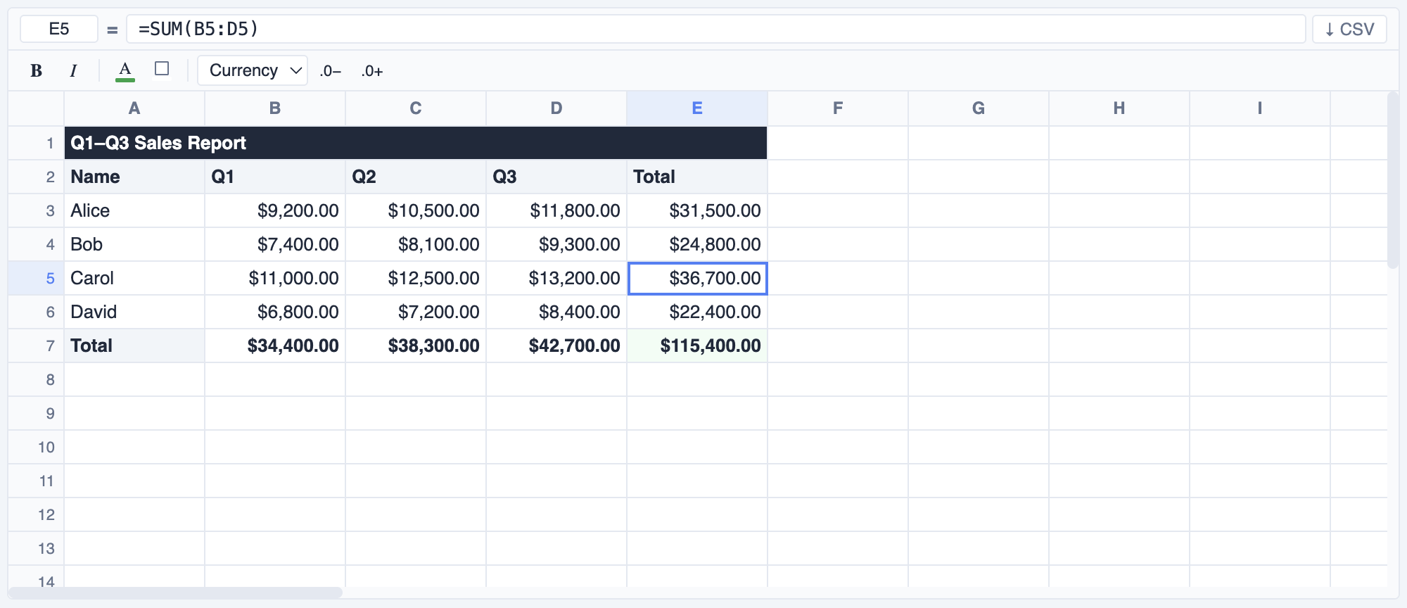 B4: "=SUM(B2:B3)", C4: "=SUM(C2:C3)", D4: "=SUM(D2:D3)",