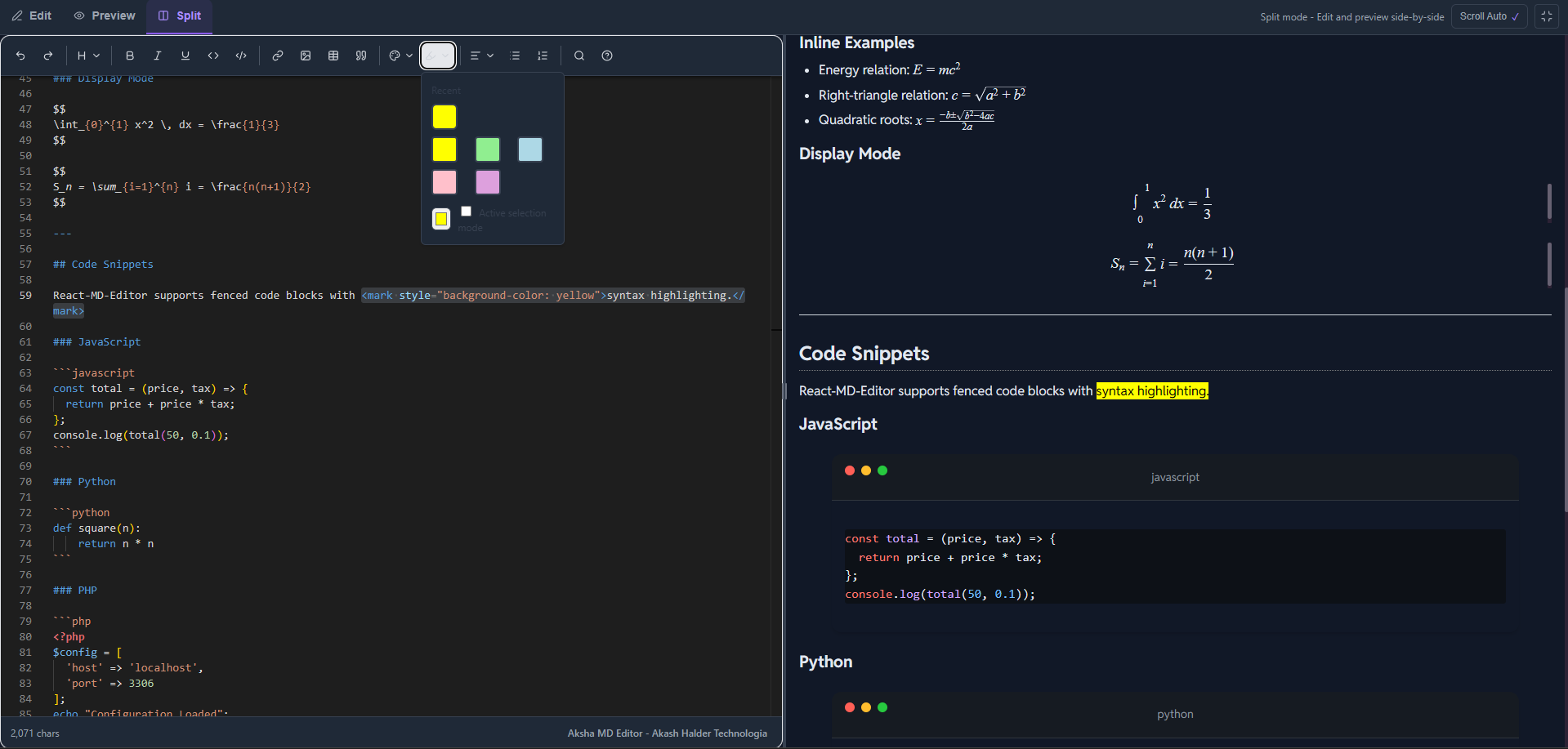 > npm install aksha-md-editor> yarn add aksha-md-editor> pnpm add aksha-md-editor🚀 Quick Start