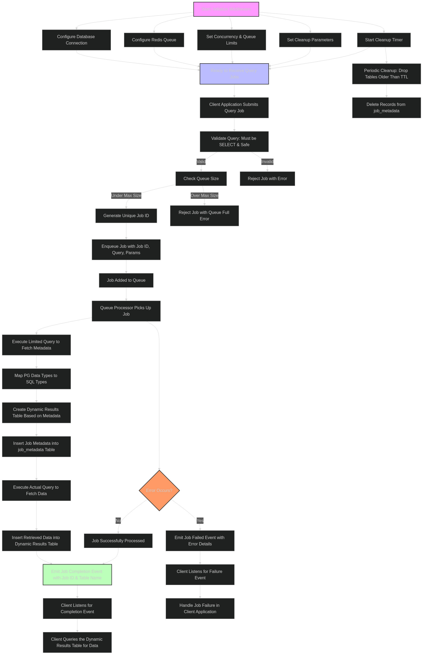 SELECTqueries to the middleware, which validates and enqueues them. - Queue Processing: The middleware processes queued jobs based on the defined concurrency limits. It executes each query, creates a dynamic results table matching the query's schema, and inserts the fetched data.