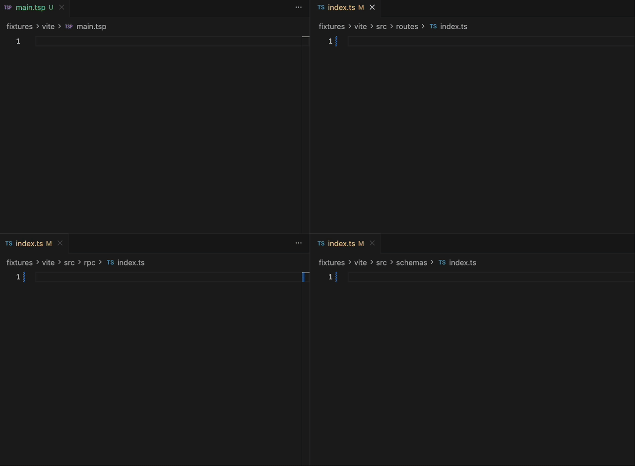 input, and nearby**/*.{yaml,json,tsp}. - Generates outputs per your config (single‑file or split, plus