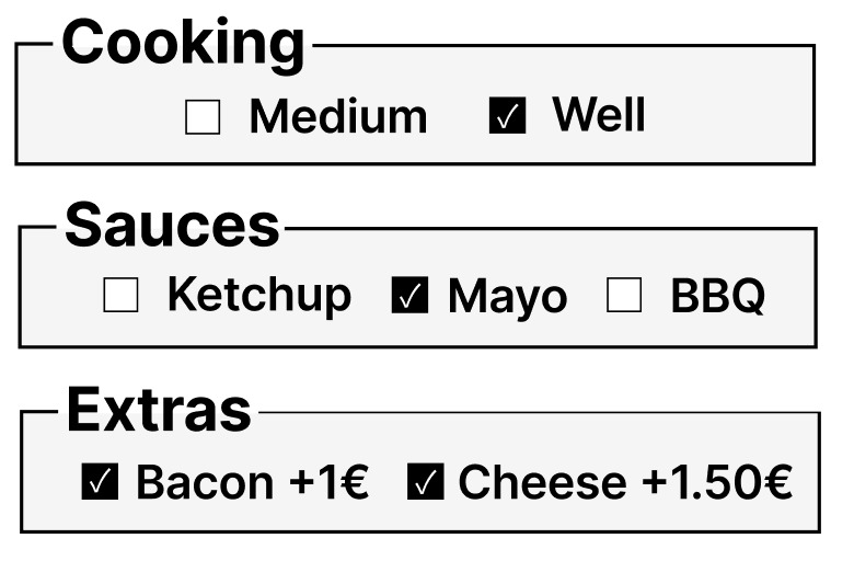 - Checkbox — Personnalisation produit par type (burger, fries, nuggets, hot-drink, cold-drink, ice-cream). Accepte des labels traduits via props
