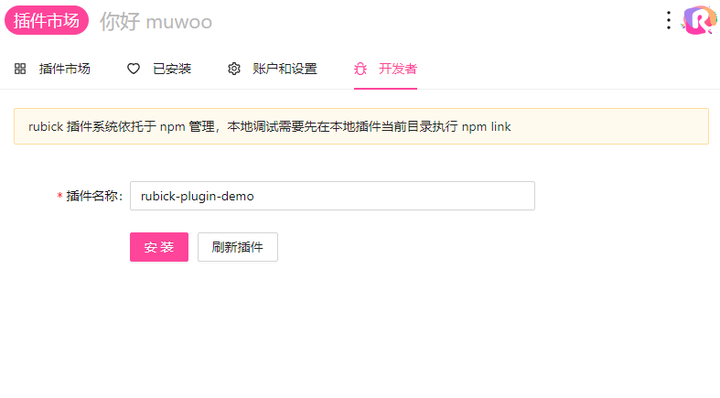 rubick插件市场 => 开发者 填写插件名称进行安装