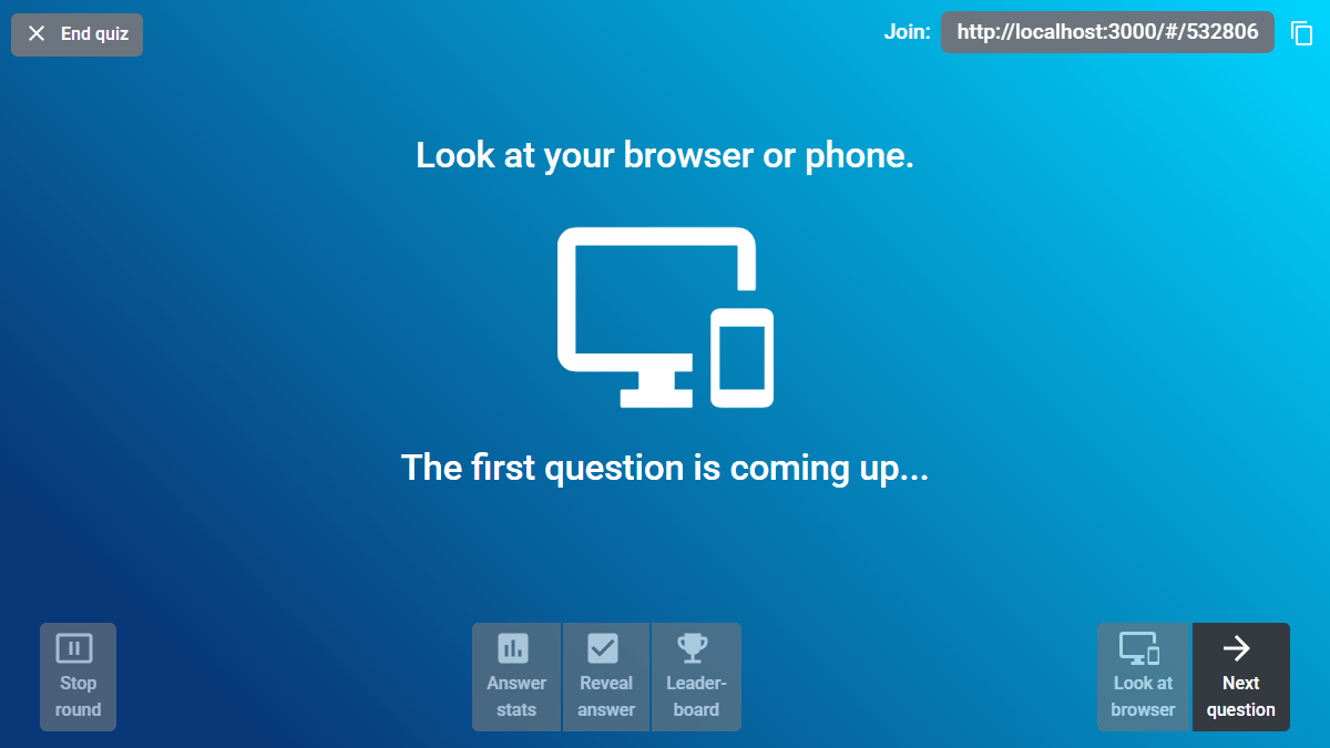 When the quiz commences, the host's screen displays a reminder, asking the players to look at their browser: