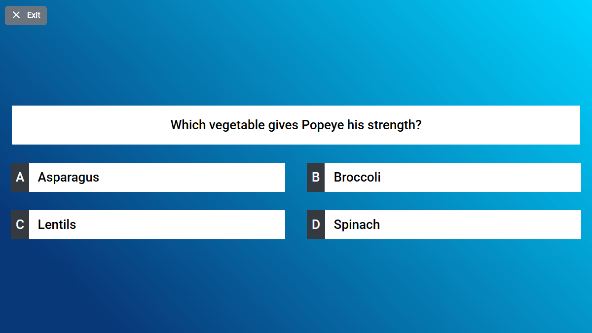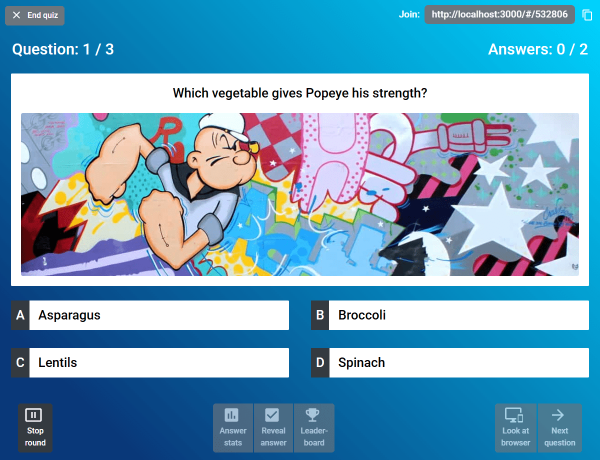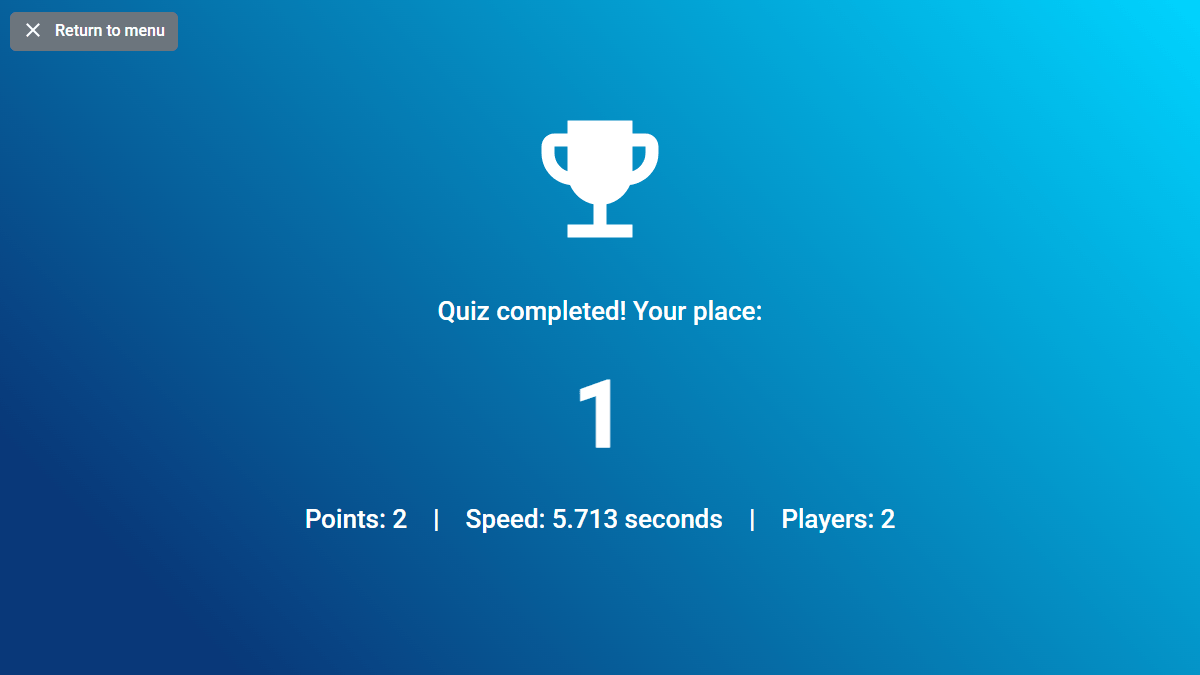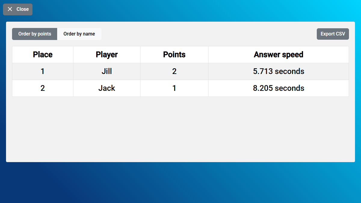 After each question, the host can also display the leaderboard. The players are ranked by the number of correct answers. Players with the same number of correct answers are sorted by their average answer speed: