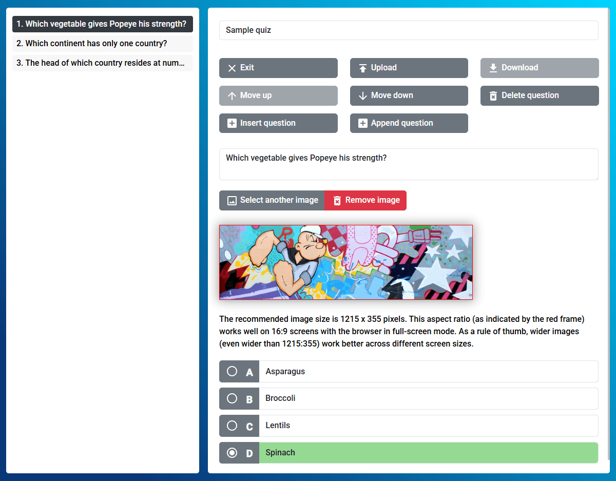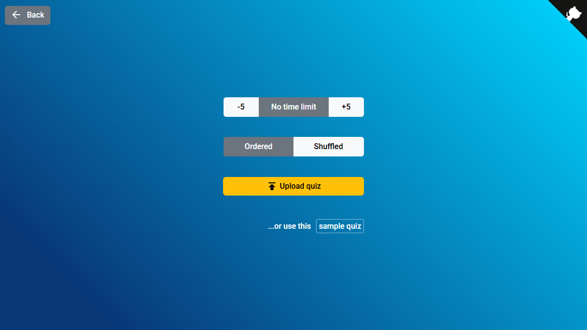 The JSON file also needs to be uploaded every time the quiz is to be hosted. The host can optionally set a time limit for submitting answers. The questions can be played in their original order (as created in the quiz editor), or they can be shuffled (played in randomized order):