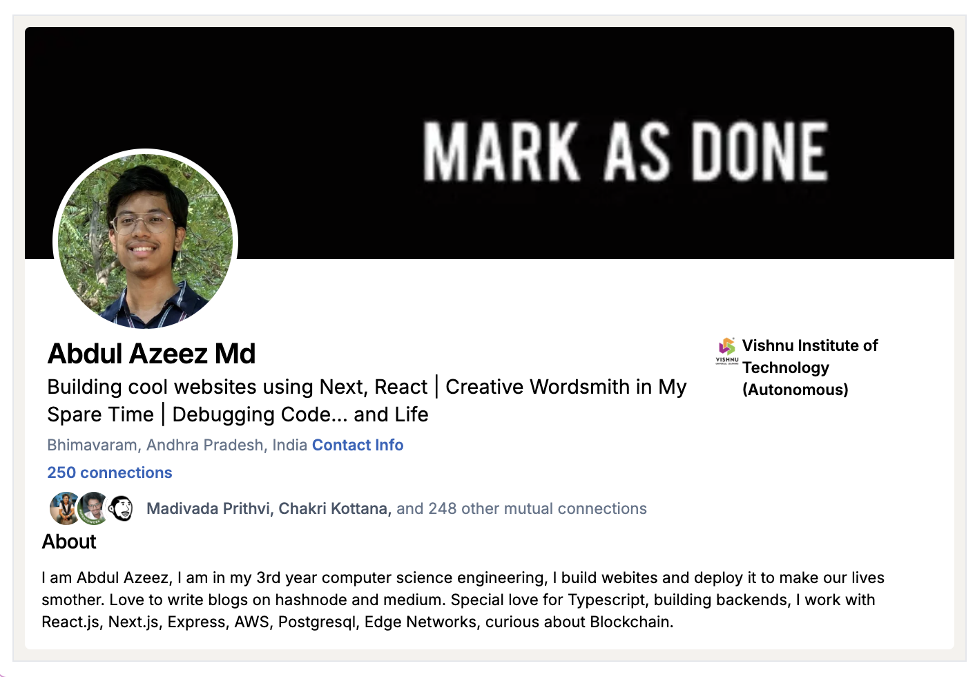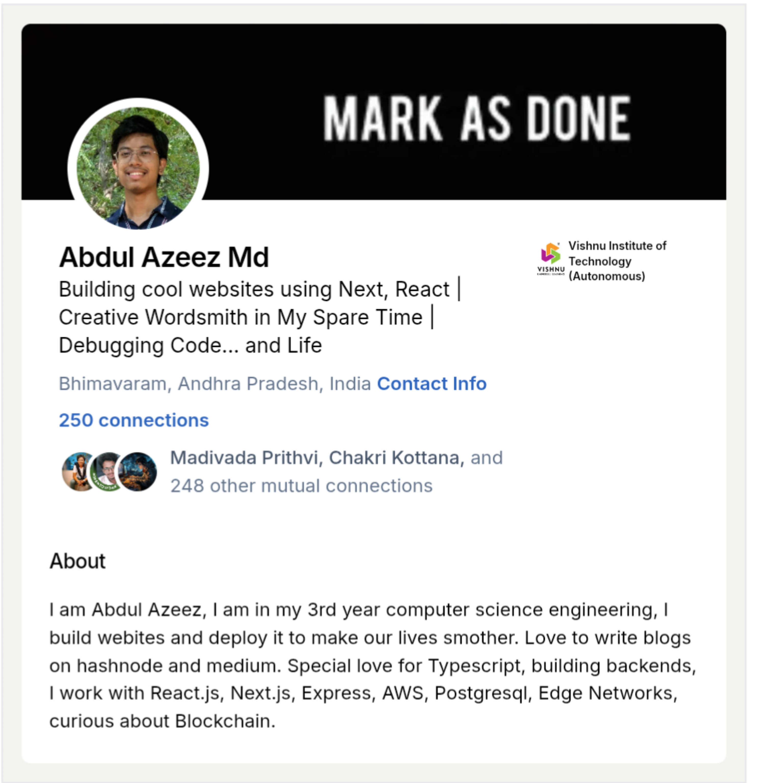 This is a LinkedIn Profile Component built using tailwind css, use this component in the react applications.